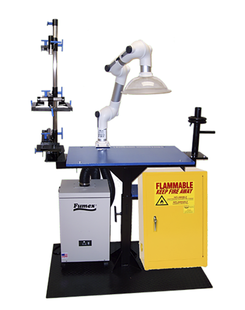 El LAMMO-S viene con hardware para alinear y laminar, una bomba de vacío de 1/2 HP con interruptor de pie, un depurador de humos de 200 CFM y un gabinete contra incendios de 12 gal. para el almacenamiento seguro de pegamentos y resinas. La unidad de depuración de humos tiene un brazo articulado para dirigir el flujo de vacío directamente a su trabajo y una luz indicadora que indica cuándo reemplazar su filtro de carbón extraíble de 40 lb. La bomba de vacío se coloca en un estante alejado del piso, dejando espacio para el depurador de humos y el gabinete contra incendios, y se opera con un cómodo interruptor de pie. El LAMMO-S está construido sobre la misma gran base que nuestras otras estaciones de trabajo y es completamente intercambiable con todo nuestro hardware de fabricación.